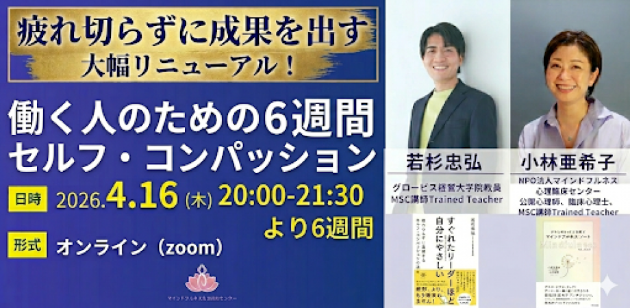 - WS・研修2026年03月09日2026年4月16日(木)より開始 働く人のためのセルフ・コンパッション6週間コース 2026年4月スタート