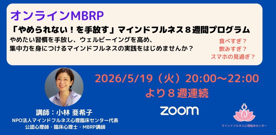 - WS・研修2026年03月31日2026年5月19日(火)より開始 「やめられない!を手放す」マインドフルネス 8週間プログラム (オンラインMBRP) 2026年5月スタート
