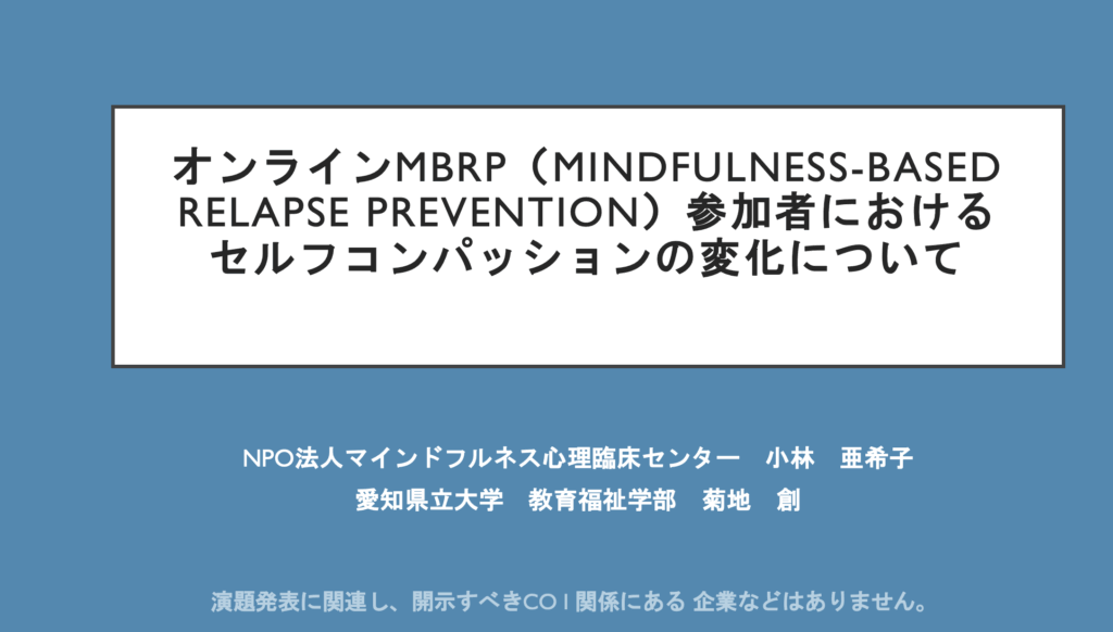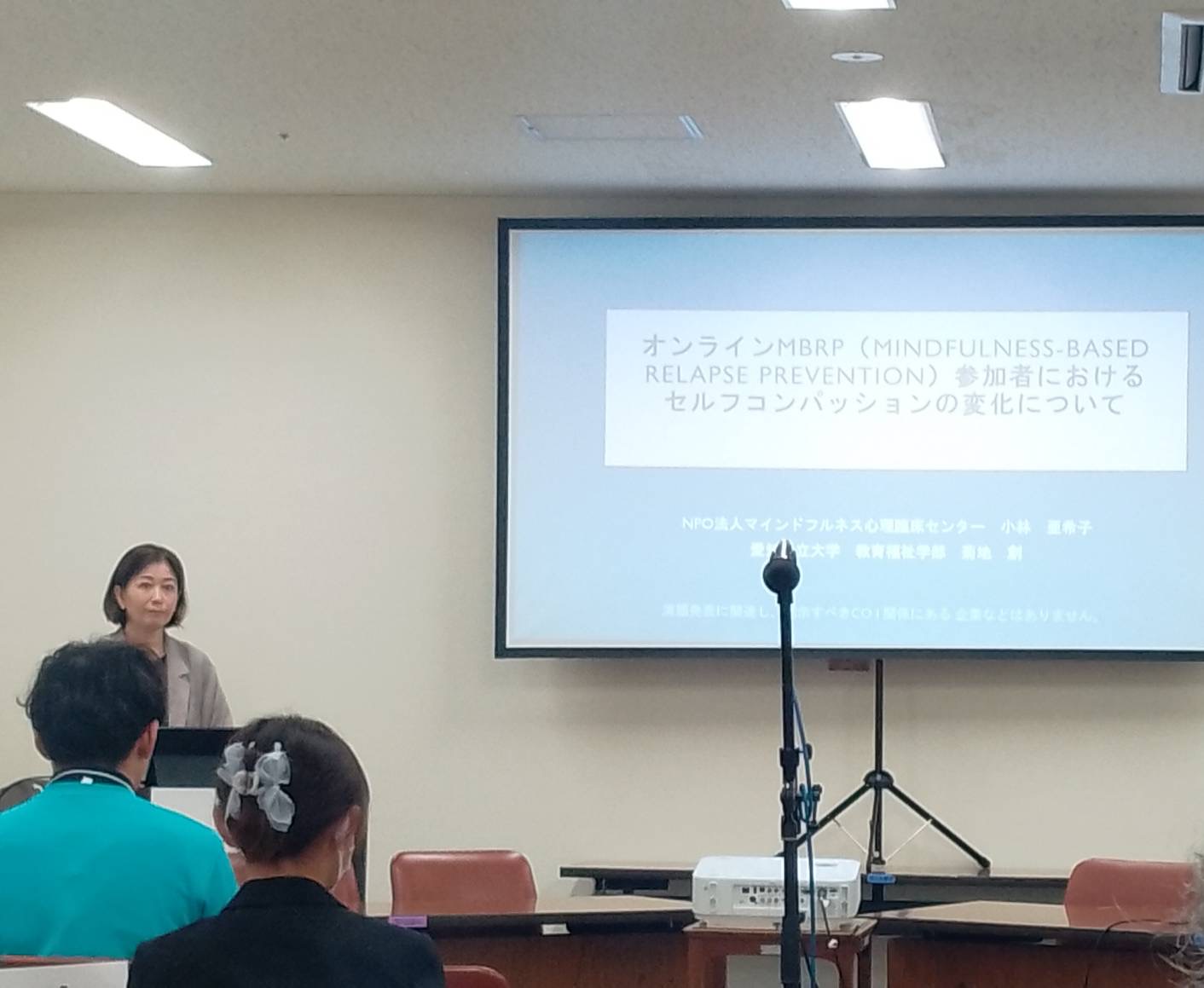 第47回日本アルコール関連問題学会(熊本)において、「オンラインMBRP(Mindfulness-Based Relapse Prevention)の参加者におけるセルフ・コンパッションの変化」をテーマとして発表を行いました。オンラインMBRPに参加した方々を対象に、事前・事後でアンケートを実施したところ、マインドフルネスおよびセルフ・コンパッションの得点がいずれも有意に上昇するという結果が得られました。さらに、各下位尺度においても特徴的な変化が確認され、今後の考察に資する重要な知見となる可能性が示されました。詳細については今後論文化を進める予定です。